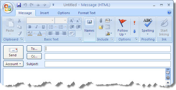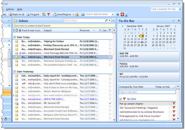 Oddly, Outlook 2007 does not use the new ribbon in it's main application window, but rather only within the Outlook items themselves (e-mails, tasks, contacts, and so on). In contrast, all other Office 2007 products have made the replacement in the main application window. That's all I am going to say about command ribbons since the changes there are fairly independent from the TWC system. A little experimentation on your part will lead you through a complete understanding of how they work; they are fairly intuitive. One tip to get you started: the circular Windows logo button in the upper left corner replaces the File menu of the past.