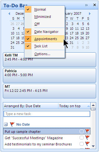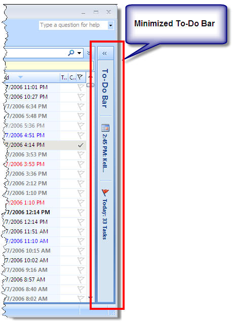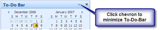 Another way to change the display state once the bar is open is to use the small buttons on the top right of the To-Do Bar. For example, to minimize you can click the small right-pointing chevron in the upper right corner of the To-Do Bar as shown below.