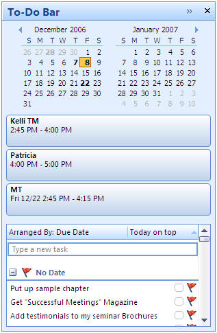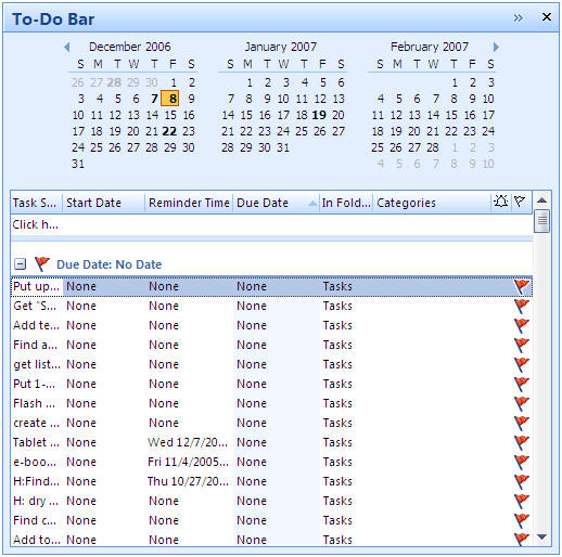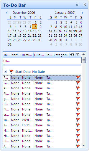 Now you can close the Customize View dialog. Below is how the new To-Do Bar looks. This should look quite close to your TWC configured TaskPad in previous versions of Outlook.