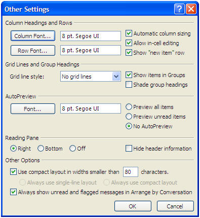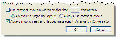 Down at the bottom of the Other Settings dialog, note the checkbox labeled Use Compact Layout in Widths Smaller Than 80 Characters. Clear that checkbox, and leave the revealed setting called Always Use Single-Line Layout selected, as shown below.
