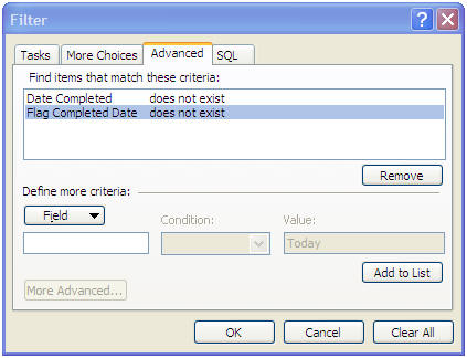 These columns are of course not right for TWC, so at this point, to complete the To-Do Bar settings, follow the Configure the TaskPad steps starting on page 67 of the book. Work those as-is until you get to section C step 2 on page 69. At that point you are going to see the conditions in the figure below. These are new compared to the book settings, and be sure to retain both of those conditions; they prevent a strange behavior in Outlook 2007 task displays with old flagged mail marked as Flag Complete.