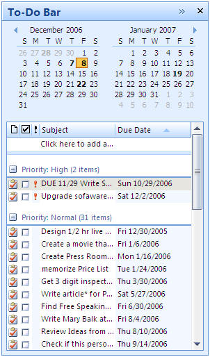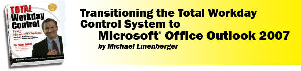 You can now start using the To-Do Bar for the TWC system just as you used the TaskPad in previous versions of Outlook. By the way, note that using the new Priority groupings, you can drag tasks from one Priority group to another to reprioritize them. One other change in the new To-Do Bar is that new tasks, when they are created, default to having today's date in the date fields. In older versions date fields of "none" were the default. This is a highly needed change and one I applaud. It makes creating new daily tasks much more smooth. By the way this new default is also true in the Tasks folder. One side effect of this is that if you create new Master Tasks directly in the Master Tasks folder, they are created with dates. So if you use the "Click here to add a task..." row to create a new master task and hit Enter, your task will immediately move out of the Master Tasks view. The lesson is that in Outlook 2007 you probably should create master tasks in that view only by double-clicking in the "Click here to add a task..." row, which opens the task dialog box where you can remove the default dates.