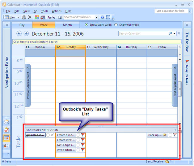 Microsoft defines “daily tasks” the way we do: tasks with dates. So they have created another place to view such tasks, and that is underneath the calendar column in the Calendar folder view (week and day views only). And the formal name for this task display is in fact “Daily Tasks.” Unfortunately though, this list is not designed very well to support the TWC system's use of daily tasks. But there is still some usefulness here. Let me explain.