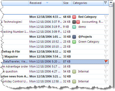 completed in past days of the week (see Monday in the figure above). Unfortunately, these are the only configurations you can make on this display. So again, it is of limited usefulness for TWC system users. E-mail News: New Emphasis on Categories in 2007 My final discussion on Outlook 2007 is about the few changes to e-mail that affect our system. By far the one you should care most about is that you will now find a major new emphasis on Outlook Categories in this version. This is true in both tasks and e-mail, (as well as appointments and contacts). As you know I am not a fan of using categories on tasks in Outlook, but if you have read my book you know I am a very strong advocate of using Outlook Categories as a core method for filing e-mail by topic. So I am delighted to see this new emphasis on categories in Outlook 2007. If you use categories for filing mail by topic, I think you'll find the enhancements very useful. Specifically, what are the new category enhancements in Outlook 2007 mail? First of all, Microsoft has added a Categories column to the default e-mail Messages view in Outlook (see right side of figure below)