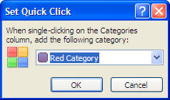 In that dialog, note that you can change the color assignment. You can also do that for any category in the main category selection window we looked at above; you click the category and use the Color: drop down mid right to change the color assignment. I mentioned there are now a few ways to assign categories to mail in your list view. I already mentioned right clicking within the categories column. Note when using the right-click method, if you repeat the process on the same e-mail item, each newly assigned category is additive; it is added next to any existing category rather than overwriting it. So what if you do want to replace it? You need to choose the existing category again from the drop down, which removes it. Then go back and assign the new category. Or just use the All Categories... choice and manipulate the checkboxes in the main category dialog at will. I also mentioned before that if you single click in the Categories column of an e-mail, a default category is assigned for you. Out of the box mine was set to the new Red Category. I found this confusing at first as I accidentally was setting categories every time I clicked. This default is called the "Quick Click" assignment and can be changed by right clicking any e-mail and choosing Set Quick Click... from the bottom of the context menu which was shown above. This opens the dialog shown below.