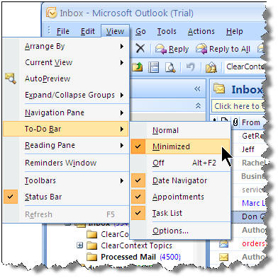 To-Do Bar to the left and right to see this reconfiguration happen. It is best to do this cleanup before you configure the To-Do Bar for the TWC settings. That's because the clean-up steps rely on the compact mode that we will hide in the TWC settings below. So do this now. Here are the cleanup steps: