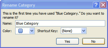 First, the concept of a separate Master Category List is not as apparent. You add categories to this list and they are added to your choice list; no need to go to a second list. I welcome that, as the master category concept of earlier versions was confusing to navigate. Next, you'll see the emphasis on colors in this dialog as well. Once installed, nearly all categories (whether pre-delivered, or converted from your previous custom categories) have colors assigned to them. And a number of new categories are created that are purely color based (with names like Red Category, Green Category, and so on). These are the six colors from the Outlook 2003 colored flags and by the way are picked up as categories on Flagged-Mail Tasks that appear from the flags in existing mail when you first install Outlook 2007. If you start using these new predefined color categories for new assignments, the first time you assign one of them, Outlook will ask you if you want to rename it to something else more meaningful, as shown below.