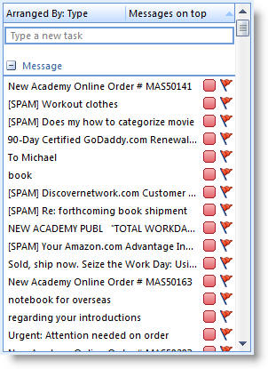 These steps group all your old flagged mail converted to tasks to the top of the task list, in its own group with the title: Message. Anything in the Message group is a flagged mail task. Here is how that looks.